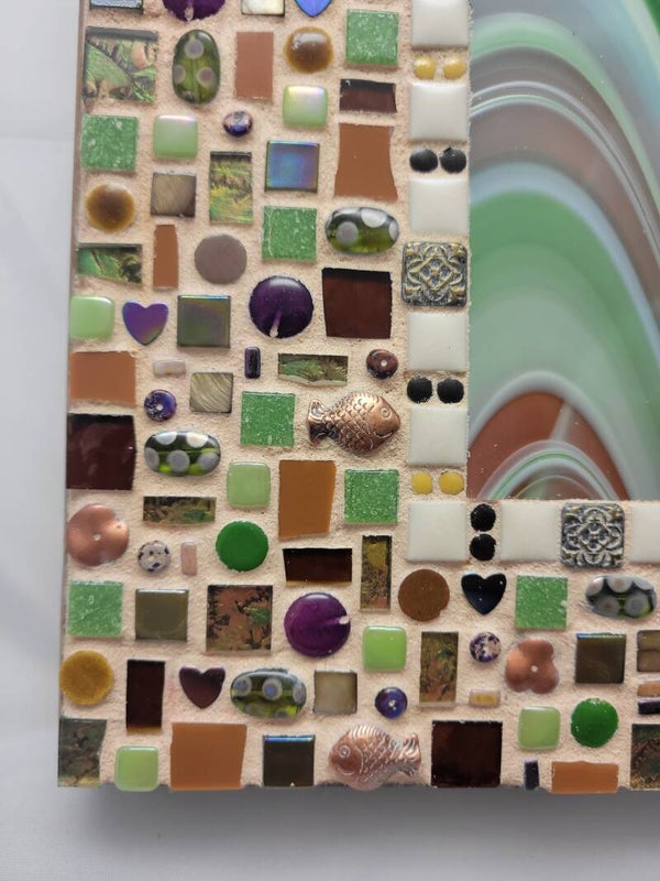 A high wooden peak along with brown and green tiles and cream grout give this a country church feeling. Green, light green and coppered marbled glass center where a standard type crucifix is placed. 16.5 in. x 11 in. x 2 in. weighing approximately 5-6 pounds.