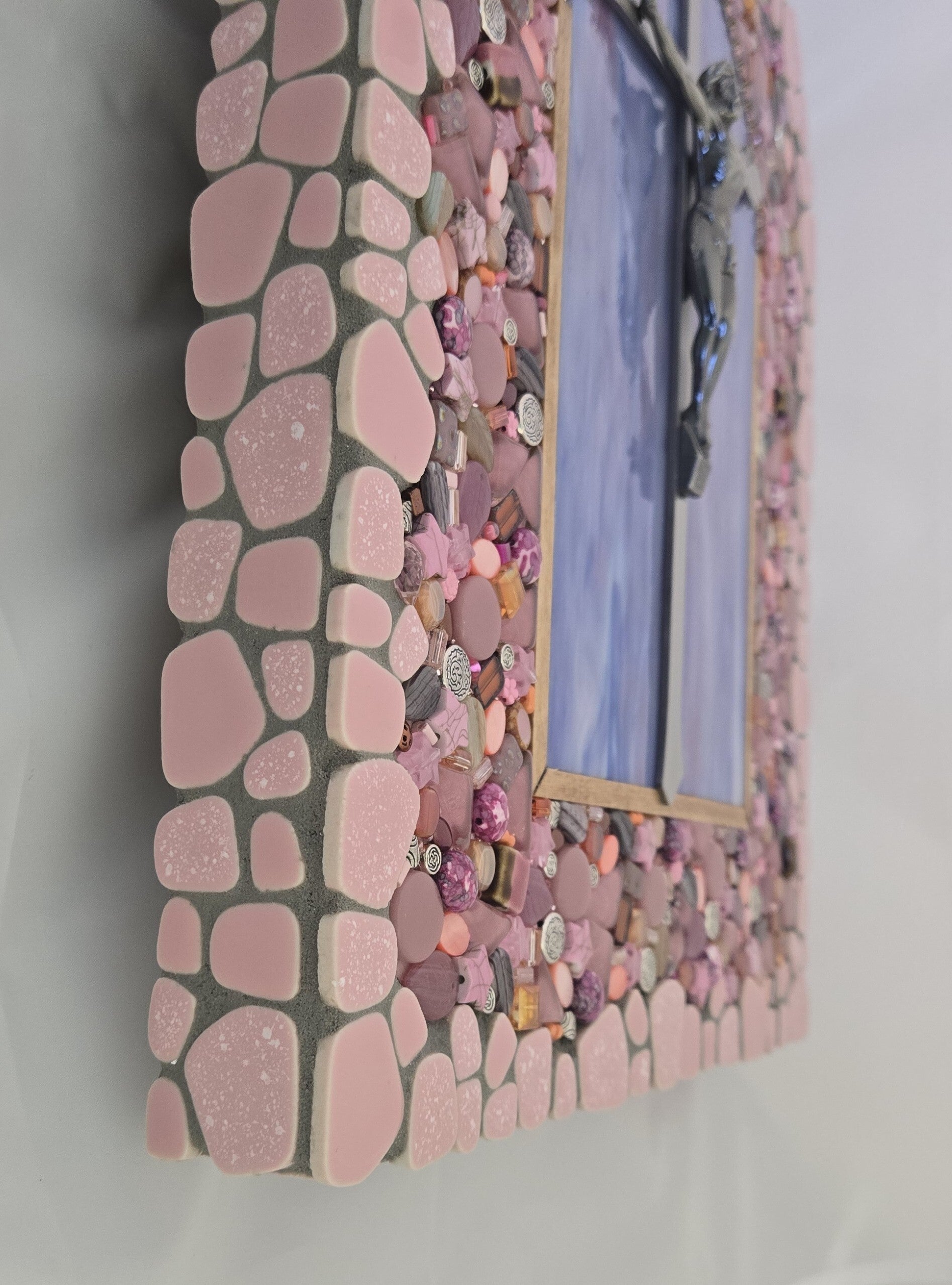 Pink antique border and edging, with non-grouted pink and orange Czech beads, silver findings, glass and ceramic tiles, misc. beads. The polished chrome crucifix sits on blue and pink highlighted stained glass with faux rose diamonds along the top, and stained wood sides and bottom. 16 x 11.5 x 2.25 inches approximate weight 6 to 7 pounds.