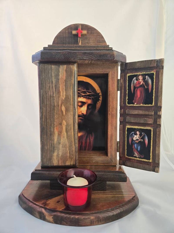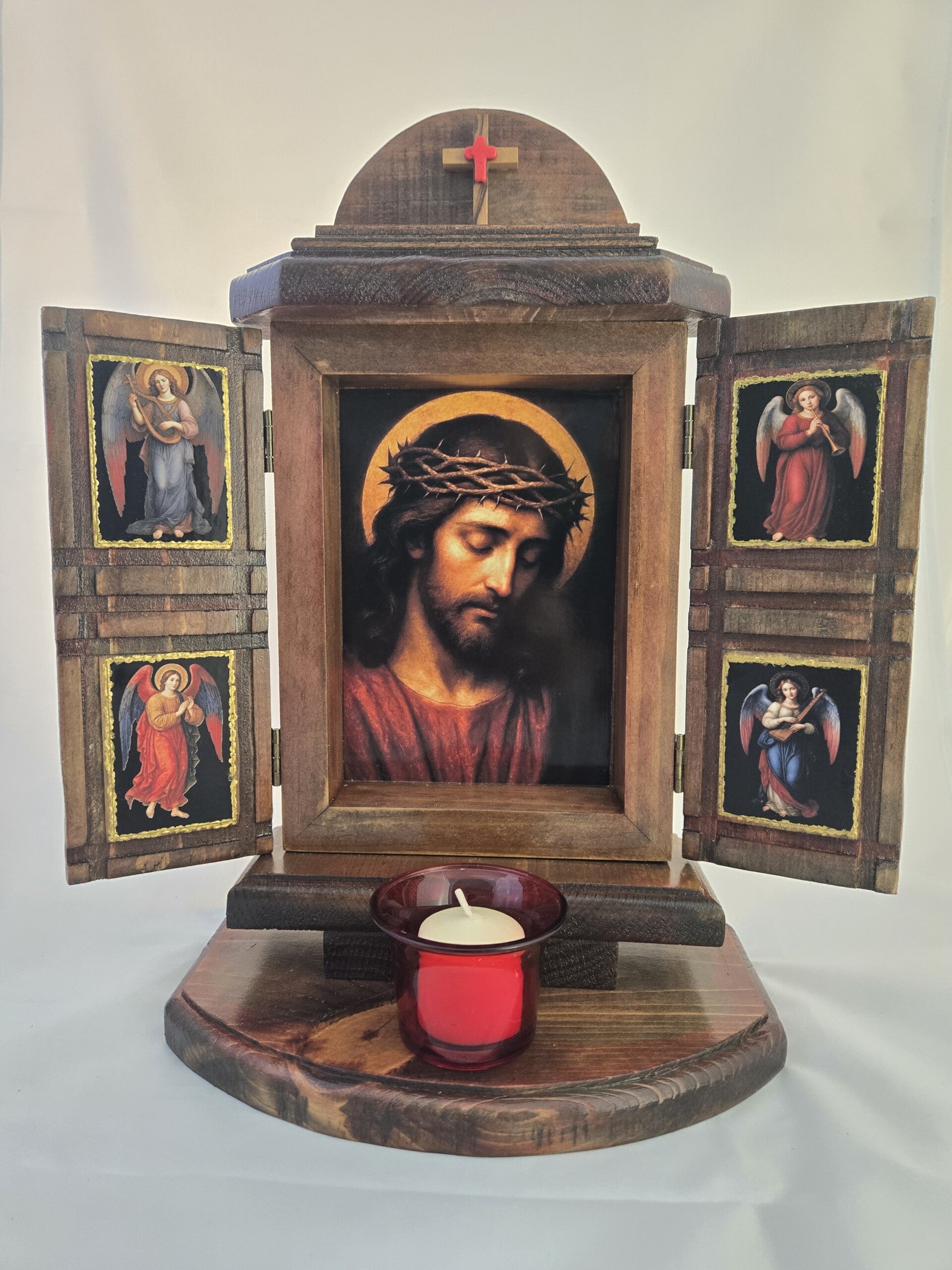 Jesus shrine with gold highlighted angels and red votive candle. AI Images on recycled wood, natural stain with red accents. 14 x 12 x 6 inches.